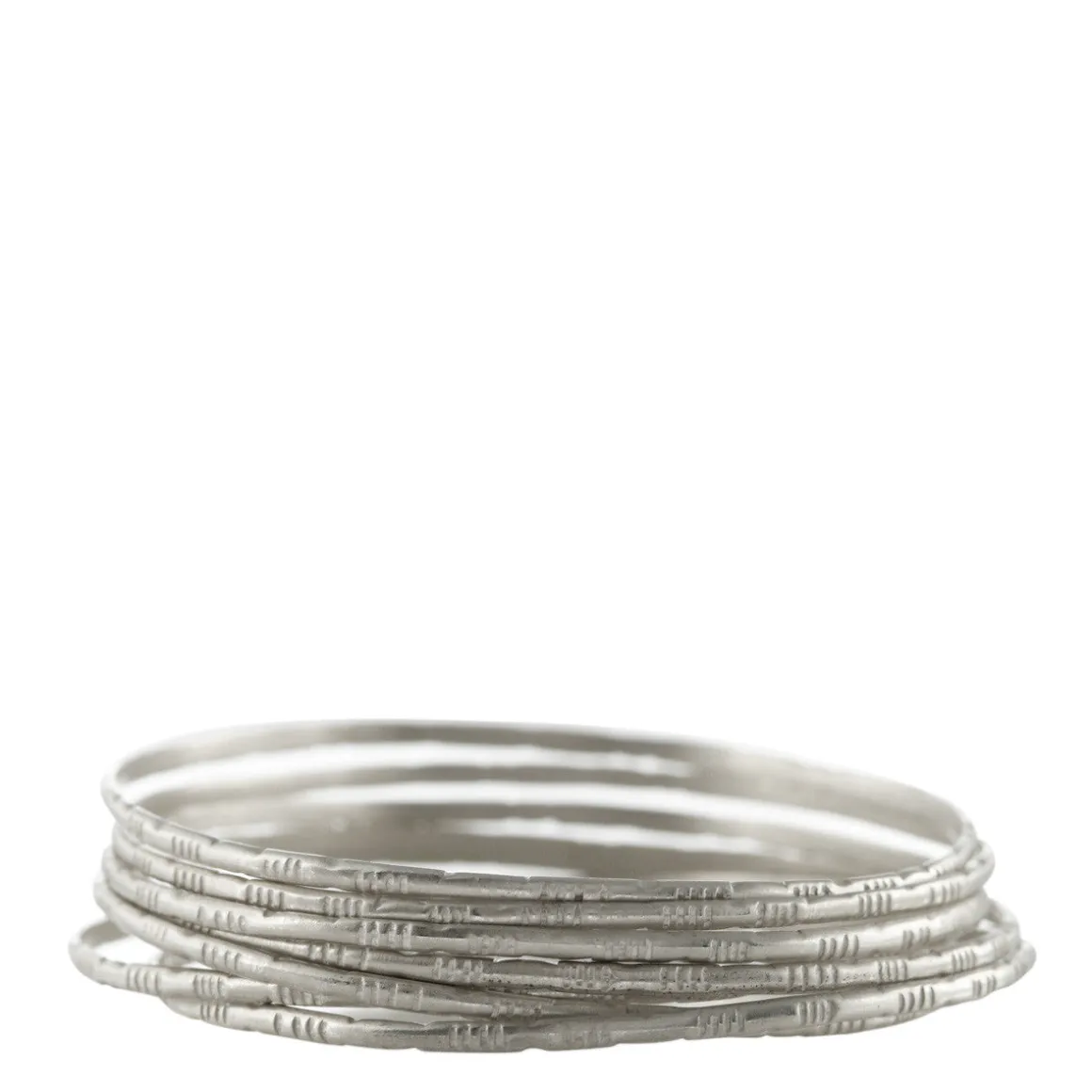 This delicately etched set of seven recycled sterling silver bangles may be worn alone or stacked. Bangles measure approximately 2 1/2″ in diameter and are each 1/16″ wide.