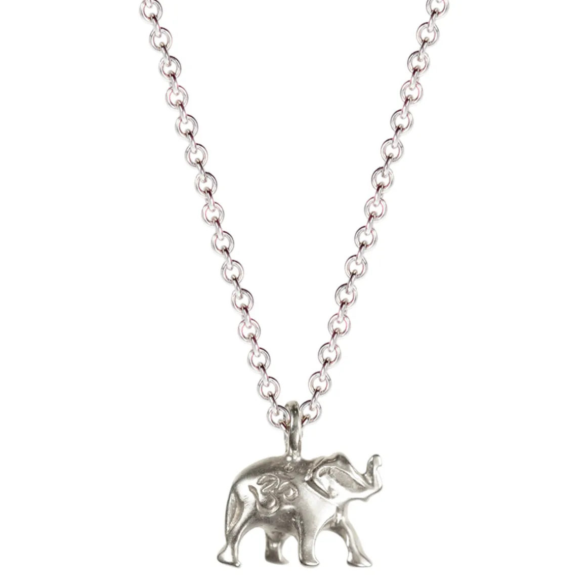 The Elephant is a revered symbol of luck, prosperity and wisdom. An elephant in stride is cast in recycledsterling silver and is engraved with an ‘Om’, the sound of the universe. It represents the divine and stands for the whole world and the sum of its parts; including past, present and future. The elephant measures approximately 1/2″ in length and 3/8″ width on a 16″ or 18″ sterling silver chain with aspring ringclosure.