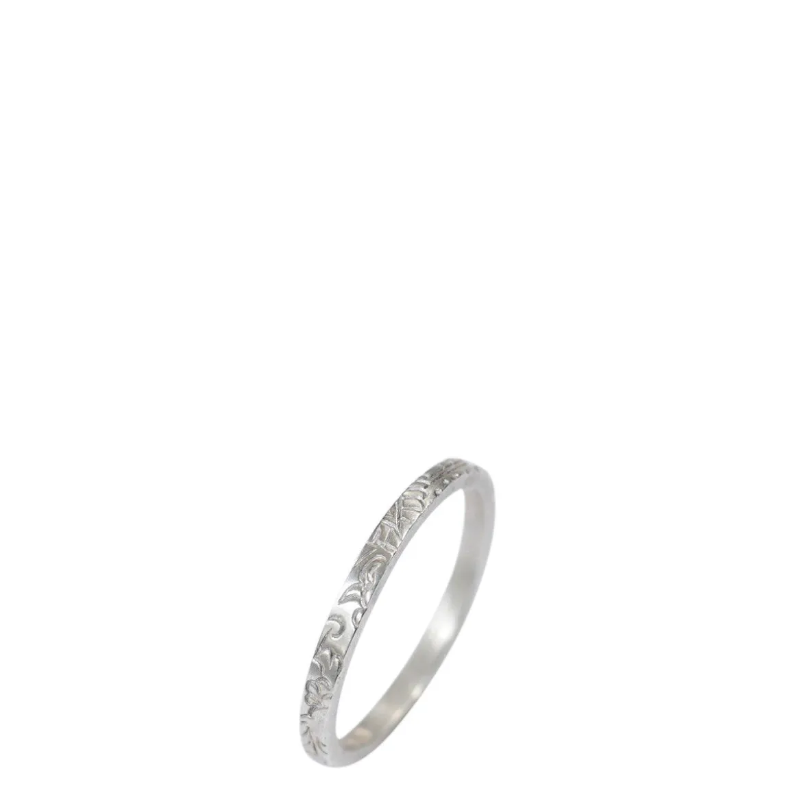 An intricate paisley pattern is engraved on this single recycled sterling silver ring. The ring exhibits a classic style with an old world feel. The ring measures approximately 1/16″ in width and is available in sizes 5 – 8.