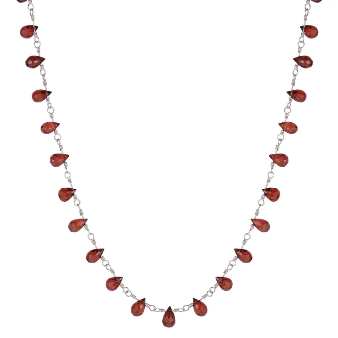 These sparkling, faceted garnet briolettes are wire wrapped together to form a simple necklace that makes a strong color statement. The necklace is available in 18″ lengths with a hook and eye closure.