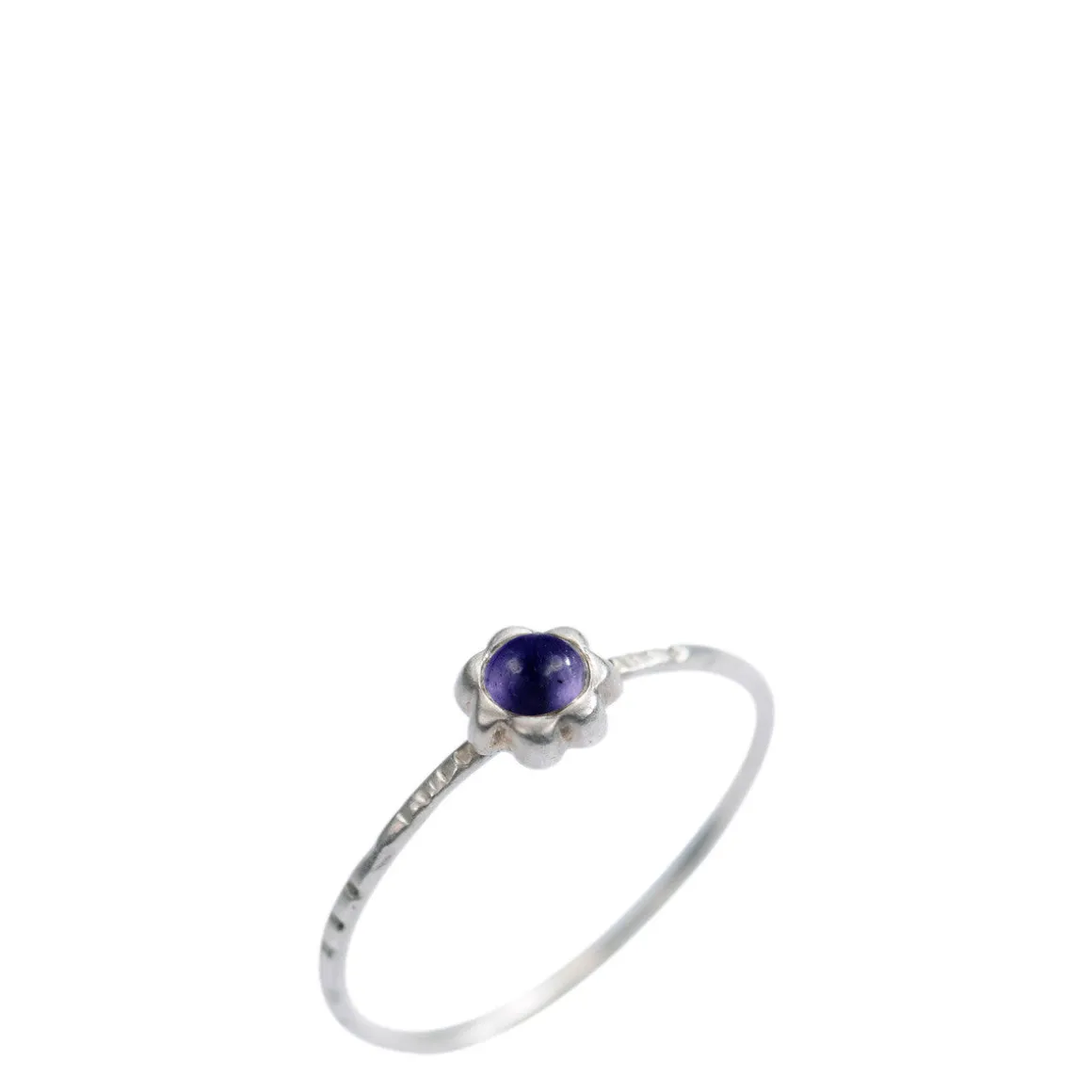 Flowers are something we all share universally as a symbol of beauty. They are a unique and beautiful gift from Mother Nature. This beautiful star flower ring features a iolite stone on a recycled sterling silver band. Available in sizes 5-8.
