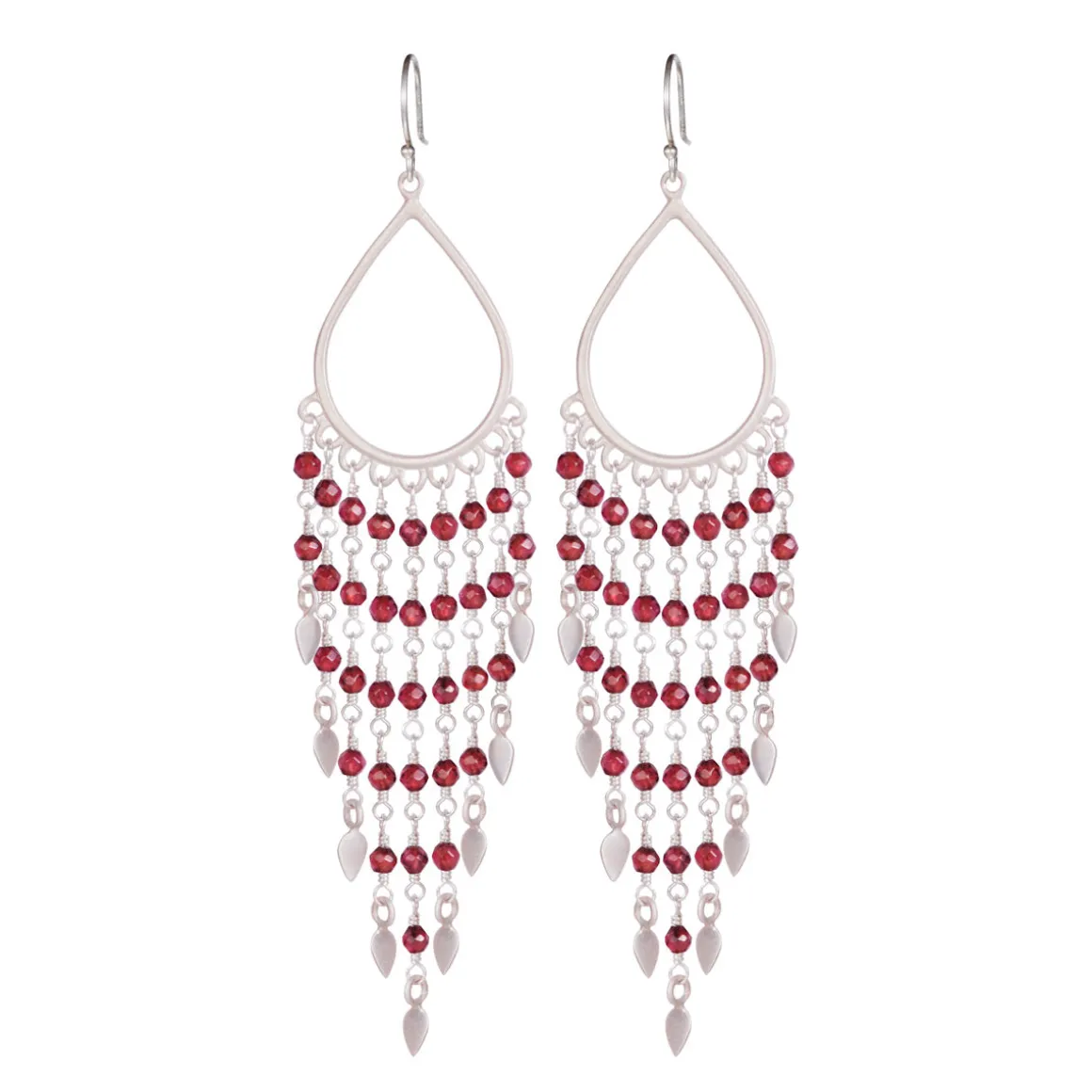 These recycled sterling silver beaded earrings are long and sexy, with colorful garnets that sparkle and shimmer as they gracefully move with the wearer. These hand-beaded limited edition earrings feature 9 strands of garnet beads that each end in a tiny sterling silver petal. The strand lengths vary from 3/4″ to 2 3/4″ in length. The entire earring measures approximately 3 3/4″ in length from the ear wire, and 3/4″ at its widest.