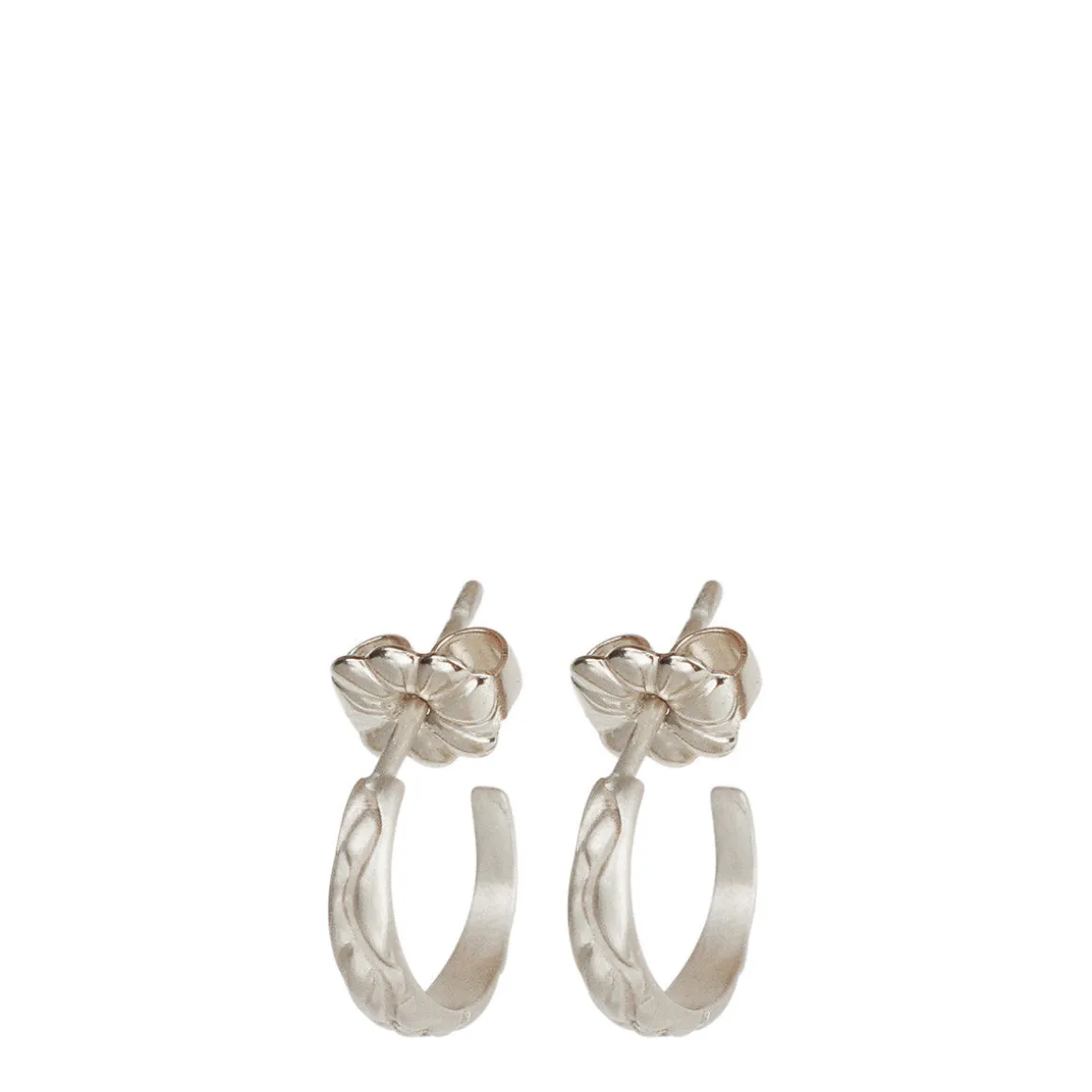 These classic tiny engraved hoop earrings hug the ear and are perfect for every day. The simple recycled sterling silver hoop earrings measure about 0.375” in diameter and hang on sterling silver ear posts.