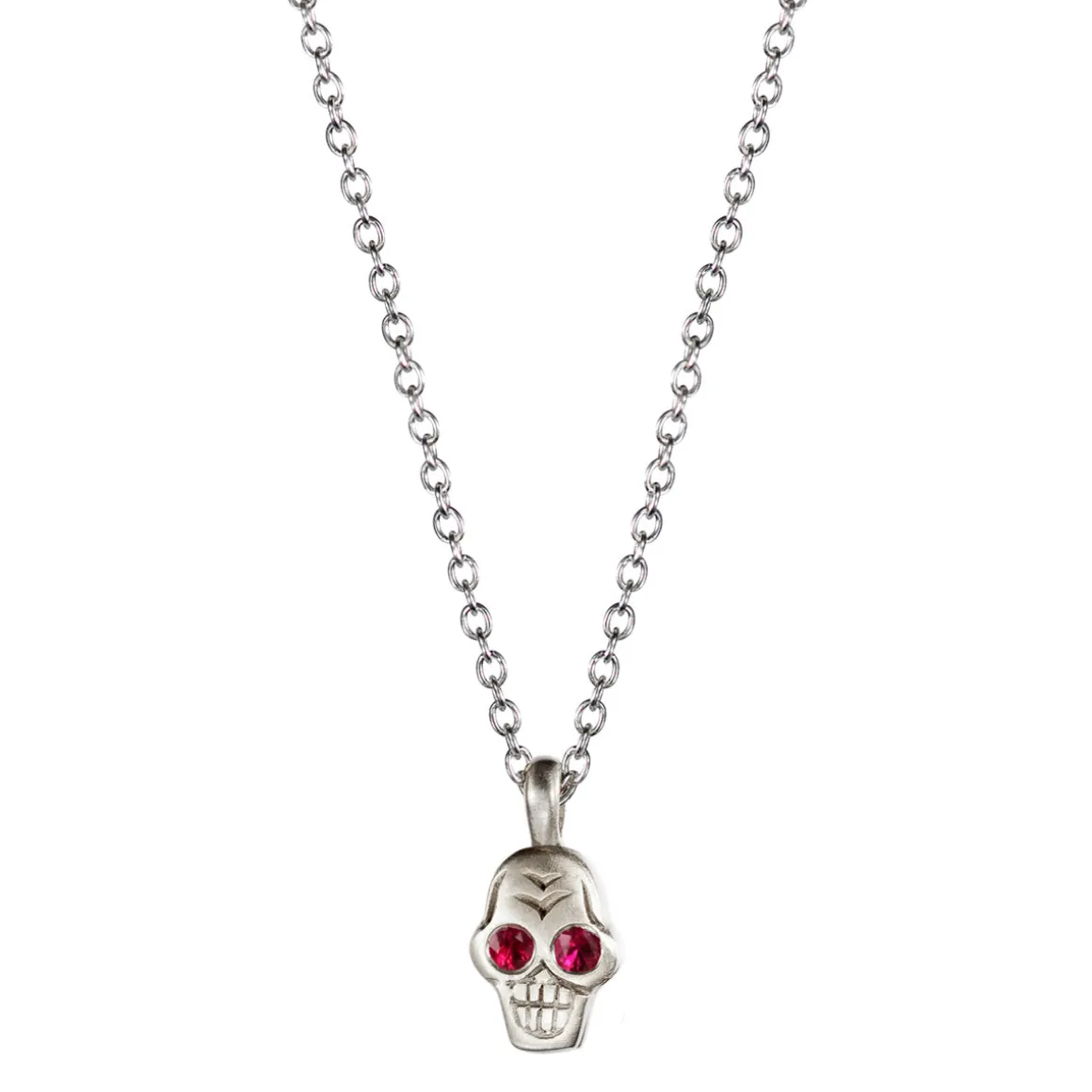 The skull is a reminder that all things will pass, that there is wisdom in living in the face of such mortality, and, therefore, we should live fully and mindfully. This tiny recycled sterling silver skull, which measures 5/16″ by 1/4″, has ruby eyes and hangs on a silver chain with aspring ring closure.